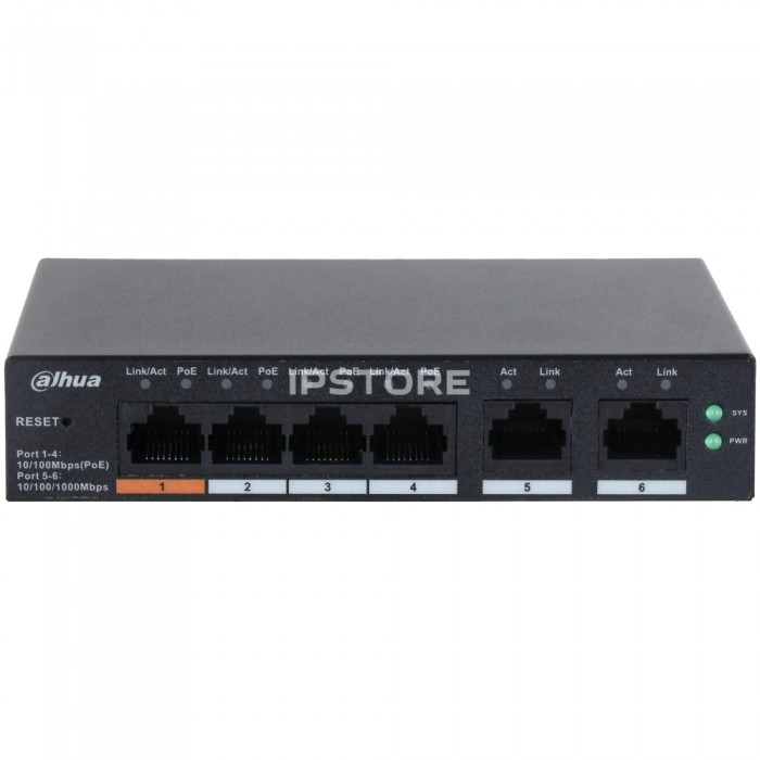 6-портовий керований PoE комутатор DH-CS4006-4ET-60 з 4 портами РоЕ, які можуть визначати і подавати живлення пристроям на базі стандарту IEEE 802.3af/at, Hi-PoE (Wi-Fi точка доступу, IP-телефон, IP-камера та ін.).