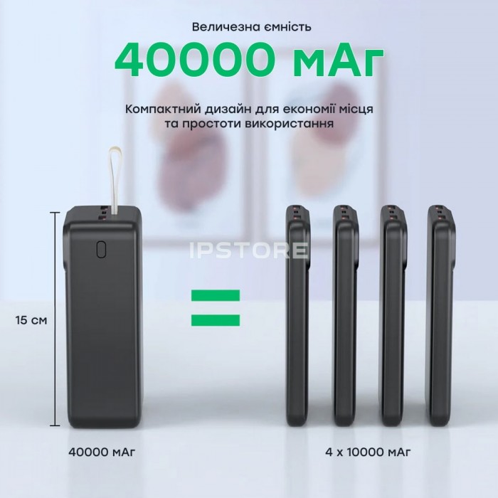 Повербанк з ємністю батареї 40000 мАг; тип батареї: літій-полімерна (Li-pol); інтерфейси: вхід/вихід Type-C, вхід: 5V/2.4A, 9V/2A, 12V/1.5 (18 Вт макс.), вихід: 5V/3A, 9V/2.22A, 12V/1.67A (20 Вт макс.); виходи USB-A1/A2:...