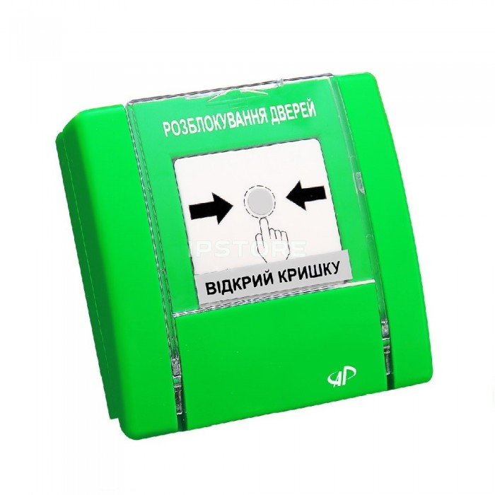 Пристрій ручного управління систем пожежогасіння та димовидалення для розблокування дверей. Напис - «Розблокування дверей», нормально-зaмкнуті контакти, механічна фіксація стану (повернення в чергове стан за допомогою ключа), без світлодіодних індикаторів, максимальний струм комутації силового ключа 500мА, ключа контролю 20мА, колір корпусу - зелений, колір кнопки - білий, розміри 102х102х38мм