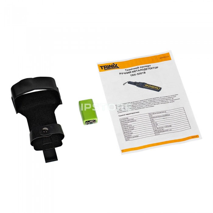Ручний металодетектор Trinix TRX5001B1 із двома режимами індикації тривоги: звук та світло/світло та вібрація. Робоча частота 18 кгц. Максимальна гучність 75 дБ. Номінальна напруга живлення 9 (працює від батареї), робочий струм 50 мА.