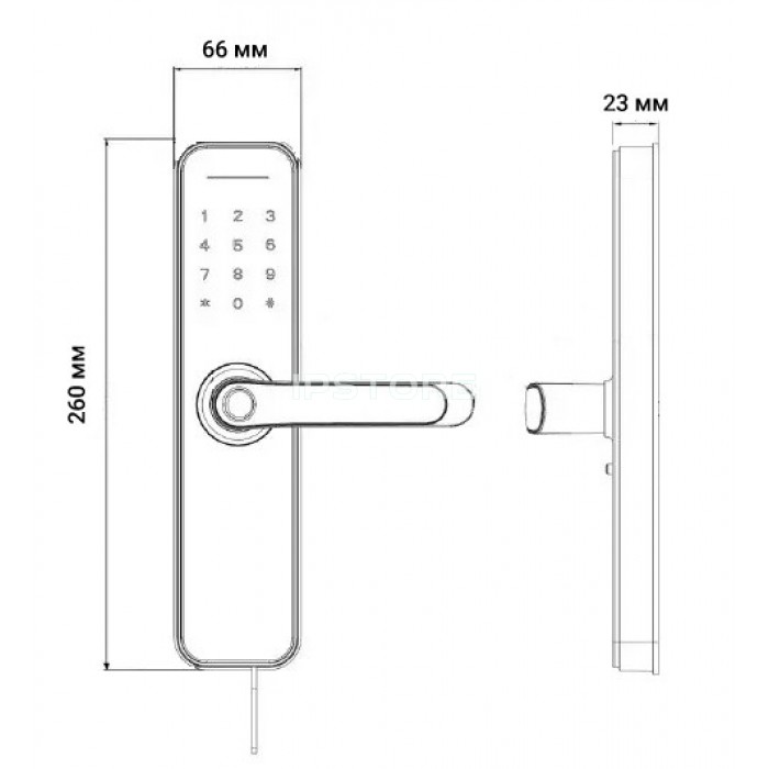 - Зручний в установці, так як не вимагає прокладання проводів (працює від 4 батарейок 1.5 V AA). Батарейки не входять в комплект (вистачає на 10 000 відкриттів замку).