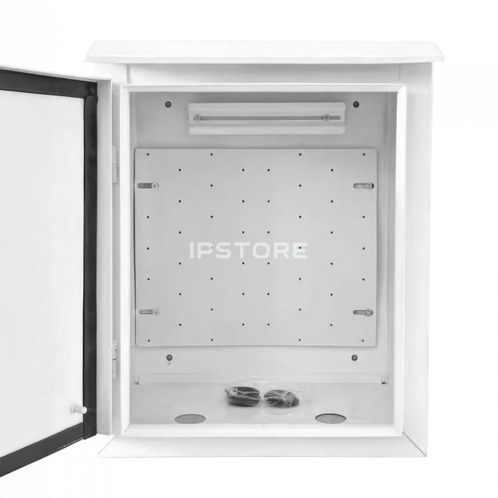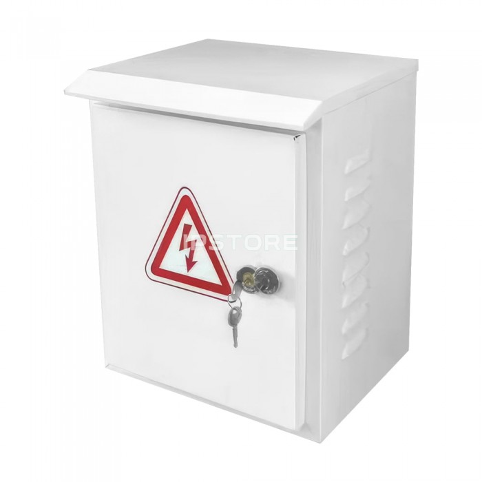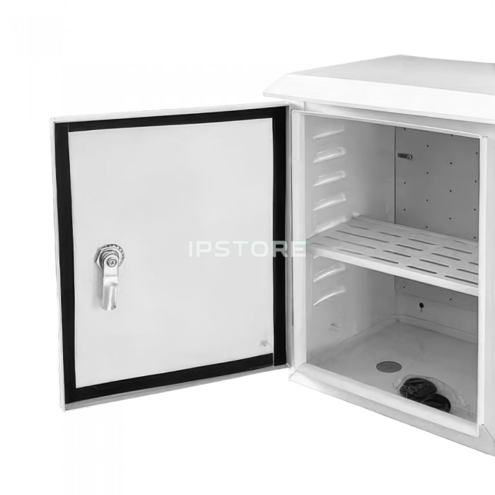 Шкаф металлический водонепроницаемый для навесного монтажа; максимальная нагрузка: на шкаф 7 кг, на 1 полочку 3 кг; две съемные полочки; замок с ключами; направляющая и изоляционная монтажная панель; кабельные вводы; металл толщиной 1 мм; размеры 372/300/250 мм (270 мм с козырьком)