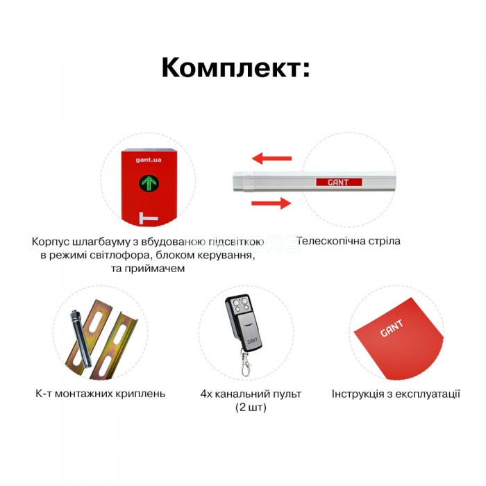 Телескопічна алюмінієва стріла регулюється по довжині (4-6 м), оснащена доводчиком і світловідбиваючими елементами, що забезпечує плавну і безпечну роботу в будь-який час доби. Вбудований світлодіодний індикатор виконує функцію світлофора, допомагаючи оптимізувати рух і знизити ризики при проїзді. Конструкція і функції GANT STRIKE розраховані на безперебійну роботу в інтенсивних умовах експлуатації.