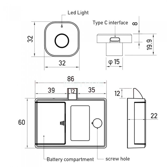 Розміри: зовнішній блок Ø32 x 8 мм, замикаючий механізм 60 x 86 x 22 мм