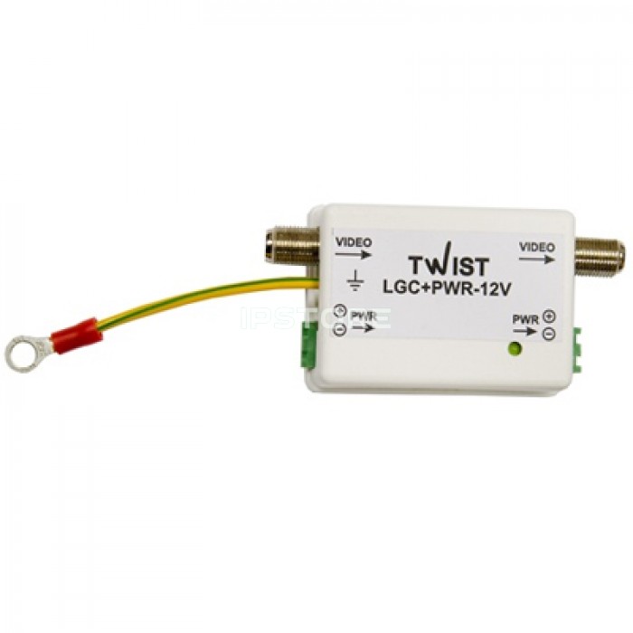 Здвоєний пристрій захисту від наведеної імпульсної напруги Twist LGC+PWR-12VDC використовується для одночасного захисту відеосигналу форматів D1, 960H, HDTVI, HDCVI, AHD та живлення камери 12 В потужністю не більше 12 Вт. Встановлюється безпосередньо біля камери, сумісний із системами резервування живлення (ДБЖ, акумулятор). Робочий стан захисту лінії живлення індикується зеленим світлодіодом. При тривалому перевантаженні, переполюсуванні, а також подачі змінної напруги в лінії живлення можливе згоряння запобіжника. У цьому випадку для відновлення робочого стану захисту замініть запобіжник (1А).