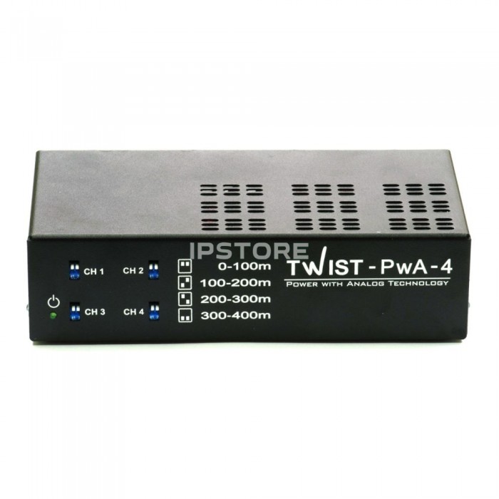 4-х канальний приймач відеосигналу і живлення відеокамер Twist-PwA-4 Rx за технологією PwA. Вбудований грозозахист 5 кВ. Габаритні розміри: 210 x 120 x 57 мм. Напруга живлення декодеру: ~ 110-250В, 50 Гц. Можливо спільне використання з кодерами: TWIST-PwA-TX IP, TWIST-PwA-TX, TWIST-PwA-TX NIP, TWIST-PwA-TX BNC.