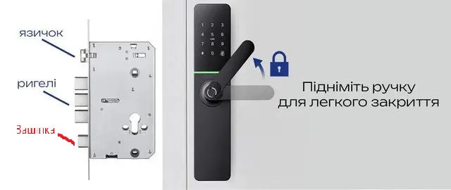 Замок поддерживает ручную блокировку изнутри: на внутренней ручке расположен переключатель электронной блокировки. В заблокированном режиме дверь можно открыть только администратору или с помощью механического ключа.