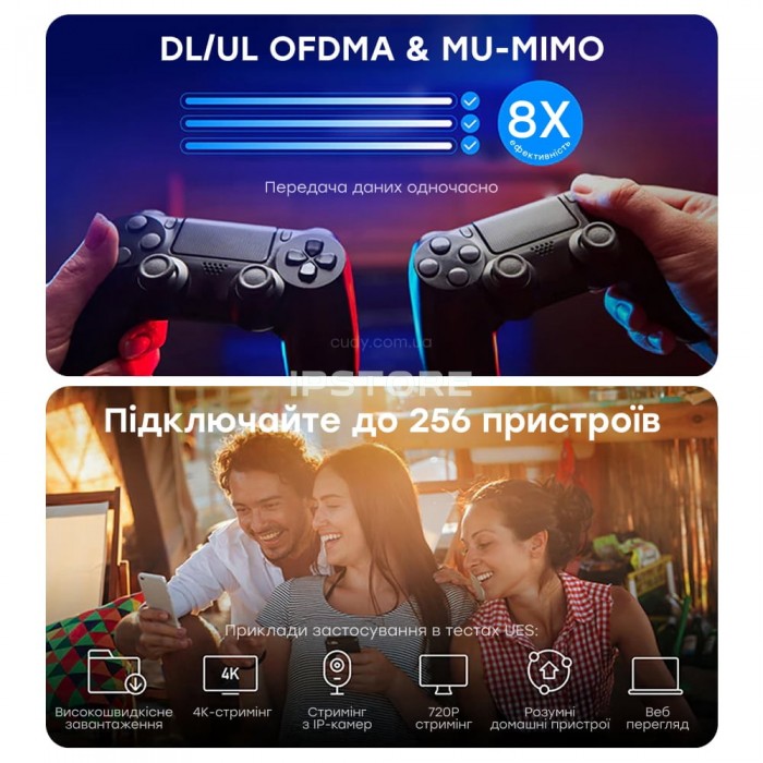- Технології MU-MIMO та OFDMA в парі знижують час очікування кожного вашого пристрою і загальну затримку мережі, що дозволить уникнути підвищених затримок в онлайн-іграх та зменшити вплив суміжних користувачів вашої мережі (ТВ, смартфони) на з’єднання.
