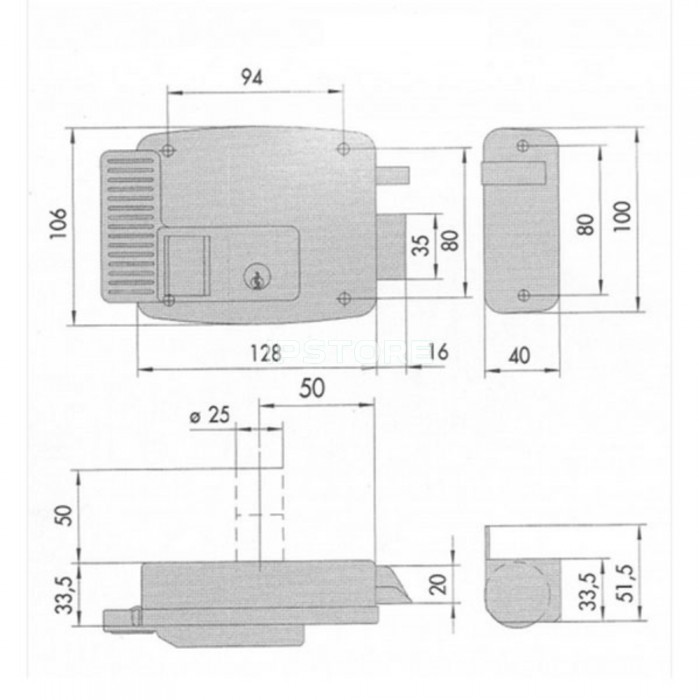 Відмикається імпульсом електричного струму (12V), а також ключем або за допомогою вбудованої механічної кнопки. У комплекті додається 5 ключів.