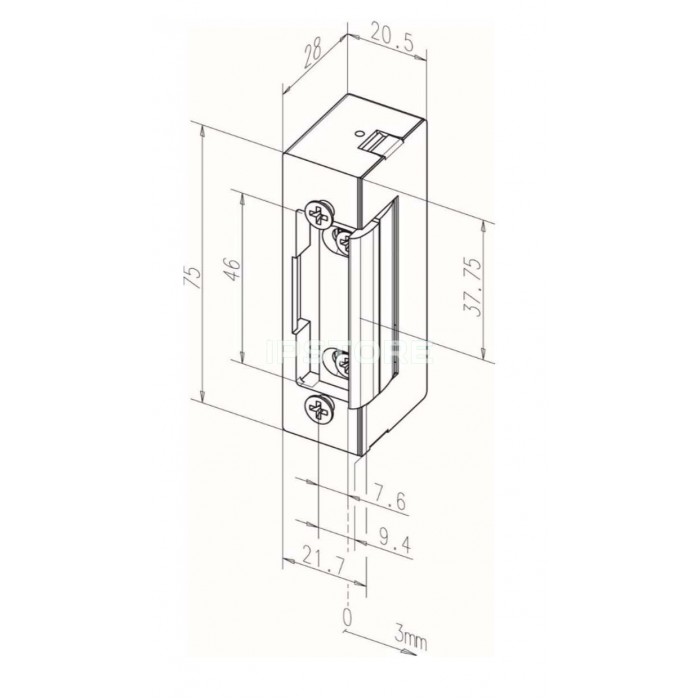 Устанавливается в дверную коробку и, в отличие от врезного электроригельного замка, не требует прокладки кабеля в дверь. Электрозащелка работает в нормально открытом состоянии. Это не означает, что она открыта без питания, а отпирание происходит снятием напряжения.